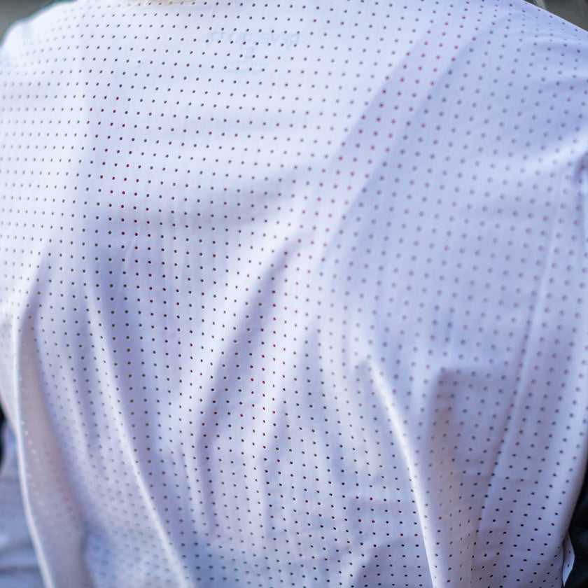 Laser cut holes at inner thigh for ventilation.
